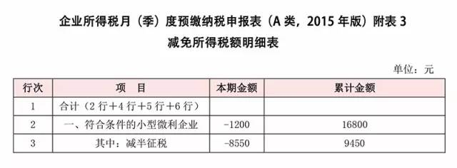 按照國家稅務(wù)總局《關(guān)于修改企業(yè)所得稅月(季)度預(yù)繳納稅申報(bào)表的公告》(國家稅務(wù)總局公告2015年第79號(hào))的規(guī)定,符合條件的小型微利企業(yè)在進(jìn)行2015年第四季度企業(yè)所得稅預(yù)繳時(shí),查賬征收企業(yè)應(yīng)按《企業(yè)所得稅月(季)度預(yù)繳納稅申報(bào)表(A類,2015年版)》第9行或第20行的全年累計(jì)所得,分不同情形填報(bào)附表3《減免所得稅額明細(xì)表》第2行“一、符合條件的小型微利企業(yè)”(以下稱“本行”)的累計(jì)和本期減免所得稅額(包括減低稅率和減半征稅所減免的稅額)。“累計(jì)金額”列的填報(bào)按規(guī)定計(jì)算方式計(jì)算的減免稅額,“本期金額”由此次申報(bào)累計(jì)金額-上次申報(bào)累計(jì)金額計(jì)算得出。