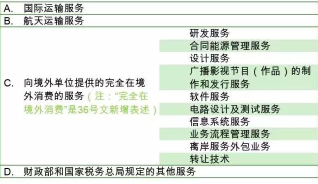 36號(hào)文對(duì)適用免稅的跨境應(yīng)稅行為分為以下類別:
