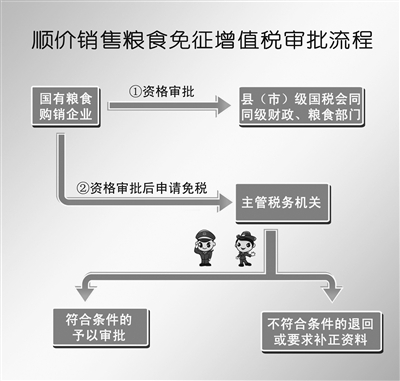 糧食企業(yè)免征增值稅實(shí)行先審批后減免。根據(jù)國(guó)稅發(fā)〔2005〕129號(hào)文件精神,符合上述免征增值稅條件的企業(yè)必須按照規(guī)定報(bào)經(jīng)有關(guān)部門審批后方可享受減免稅(流程見圖示),并按要求報(bào)送相關(guān)資料。